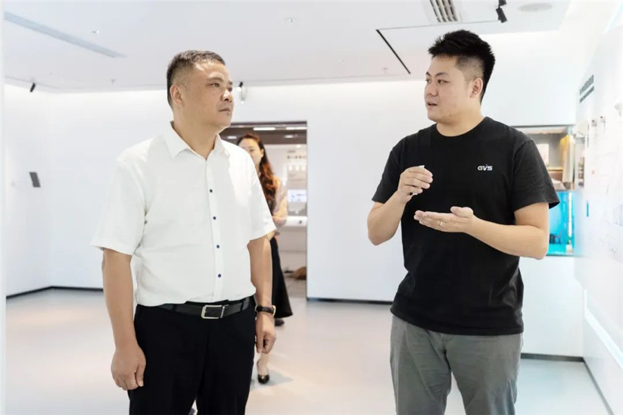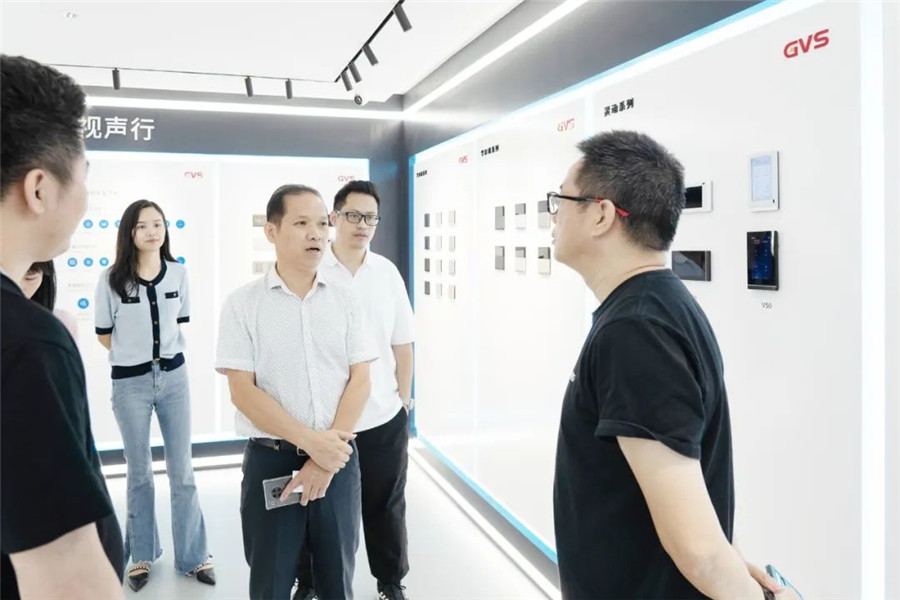 ▲圖為唯康教育團隊在GVS董事長朱湘軍、總裁彭永堅等人的陪同下參觀視聲展廳