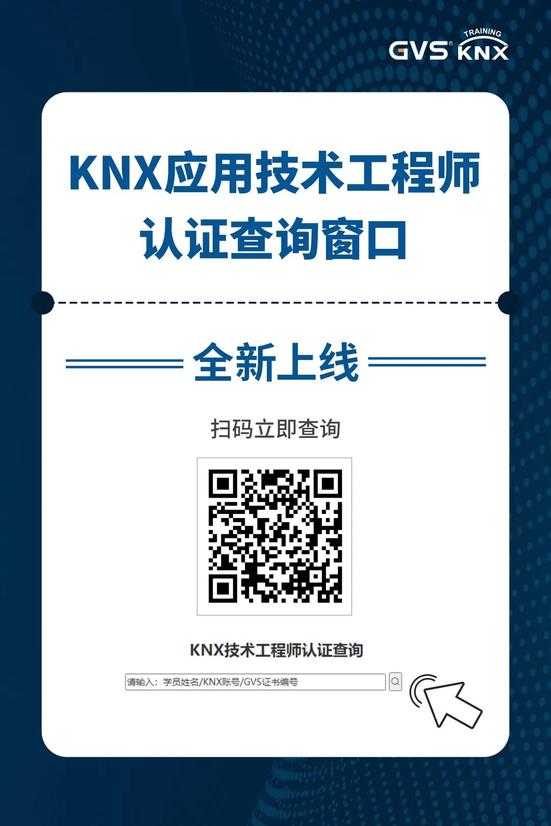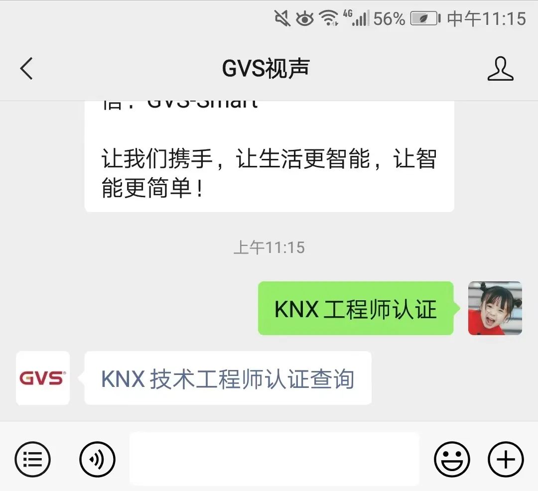 打開(kāi)公眾號(hào)“GVS視聲”會(huì)話窗口,回復(fù)關(guān)鍵詞“KNX工程師認(rèn)證”,點(diǎn)擊鏈接,輸入姓名/KNX賬號(hào)或證書編號(hào)查詢。