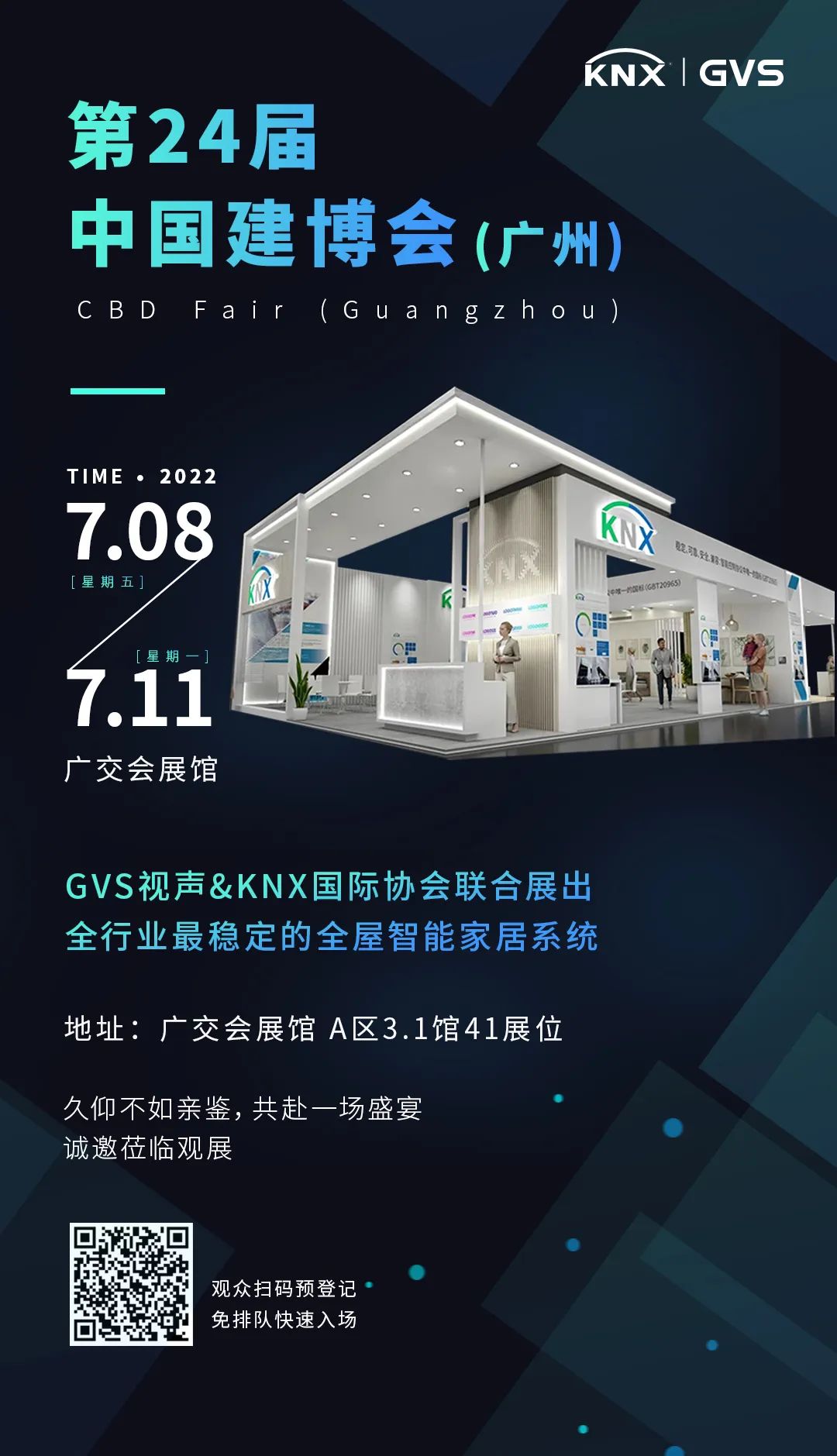 2022年7月8日-2022.7月11日,第24屆中國建博會(廣州),GVS視聲與KNX國際協(xié)會聯(lián)合展出全行業(yè)最穩(wěn)定的全屋智能家居系統(tǒng)。