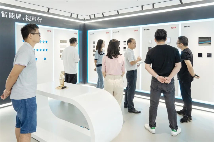 ▲圖為唯康教育團隊在GVS董事長朱湘軍、總裁彭永堅等人的陪同下參觀視聲展廳
