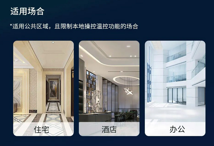 該面板適用于公共區(qū)域,如商場、辦公室等,且限制本地操控溫控功能的場合。其獨(dú)特的歐標(biāo)安裝結(jié)構(gòu),適配多品牌面板邊框,讓安裝更加方便快捷。同時(shí),其兩大盤管系統(tǒng)可選——2 管制和4 管制,以及兩路外接傳感器——干接點(diǎn)檢測和 NTC 溫度探測,滿足不同用戶的需求。