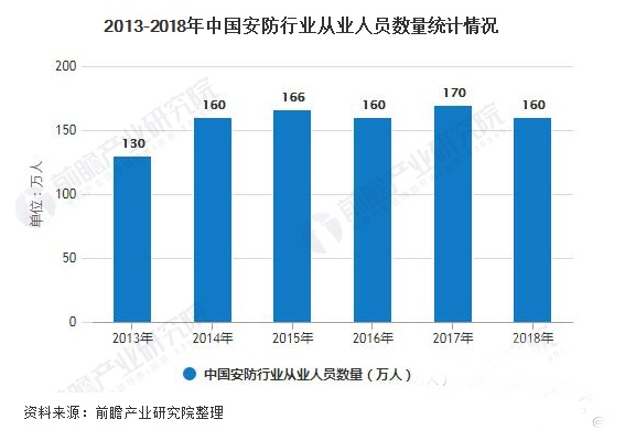 截至2018年底,中國安防行業(yè)從業(yè)人員160萬人,較2013年增加了30萬人。