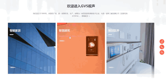 歡迎來到GVS視聲,很多關(guān)注視聲的朋友都知道,我們的服務(wù)布局3個領(lǐng)域:智能家居、智慧建筑和智慧醫(yī)養(yǎng)。為了方便大家可以更快地查找相關(guān)業(yè)務(wù)內(nèi)容,我們在首頁就設(shè)置了3個入口,非常直觀,非常簡單,非常好找。